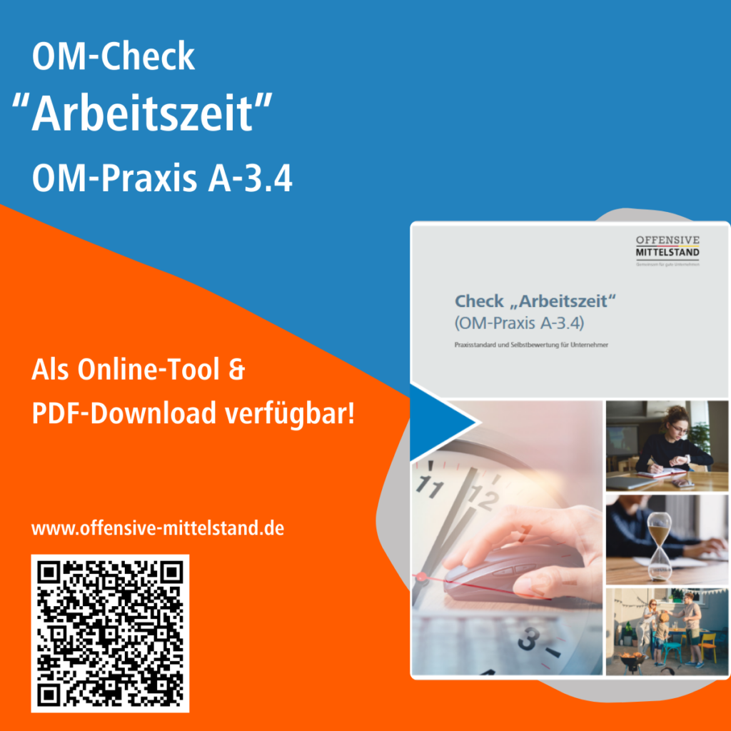 Der OM‑Check „Arbeitszeit“ ist kostenfrei erhältlich – sowohl als Online‑Tool als auch als PDF‑Download über die Offensive Mittelstand.