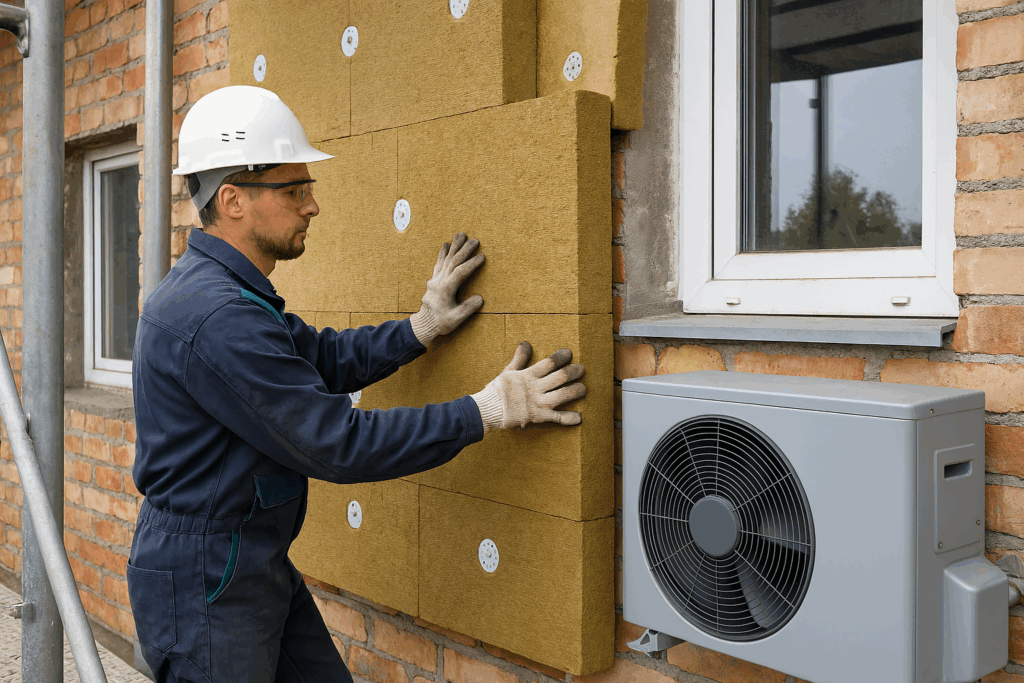 Das Bild zeigt eine energetische Sanierung im Handwerk zeigt: Fassadenmodernisierung mit Dämmplatten und einer installierten Wärmepumpe.