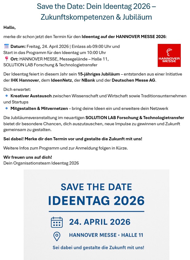 Die Veranstaltung feiert ihr 15-jähriges Jubiläum – entstanden aus einer Initiative der IHK Hannover, dem IdeenNetz, der NBank und der Deutschen Messe AG.