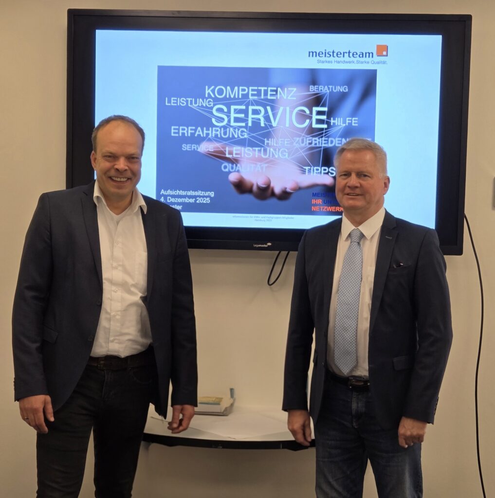 Der Aufsichtsrat des Meisterteams hat die Nachfolge in der Geschäftsführung beschlossen. Der 44-jährige Bau- und Möbeltischler Matthias Hagerott wird die Nachfolge von Thomas Schley antreten, der nach über zwei Jahrzehnten an der Spitze des Meisterteams im Jahr 2026 in den Ruhestand geht. Im Frühjahr 2026 werden Thomas Schley und Matthias Hagerott das Meisterteam gemeinsam führen, um einen reibungslosen Wechsel sicherzustellen.